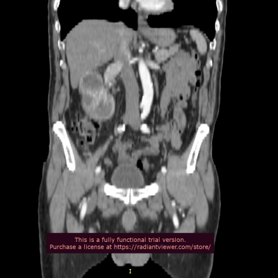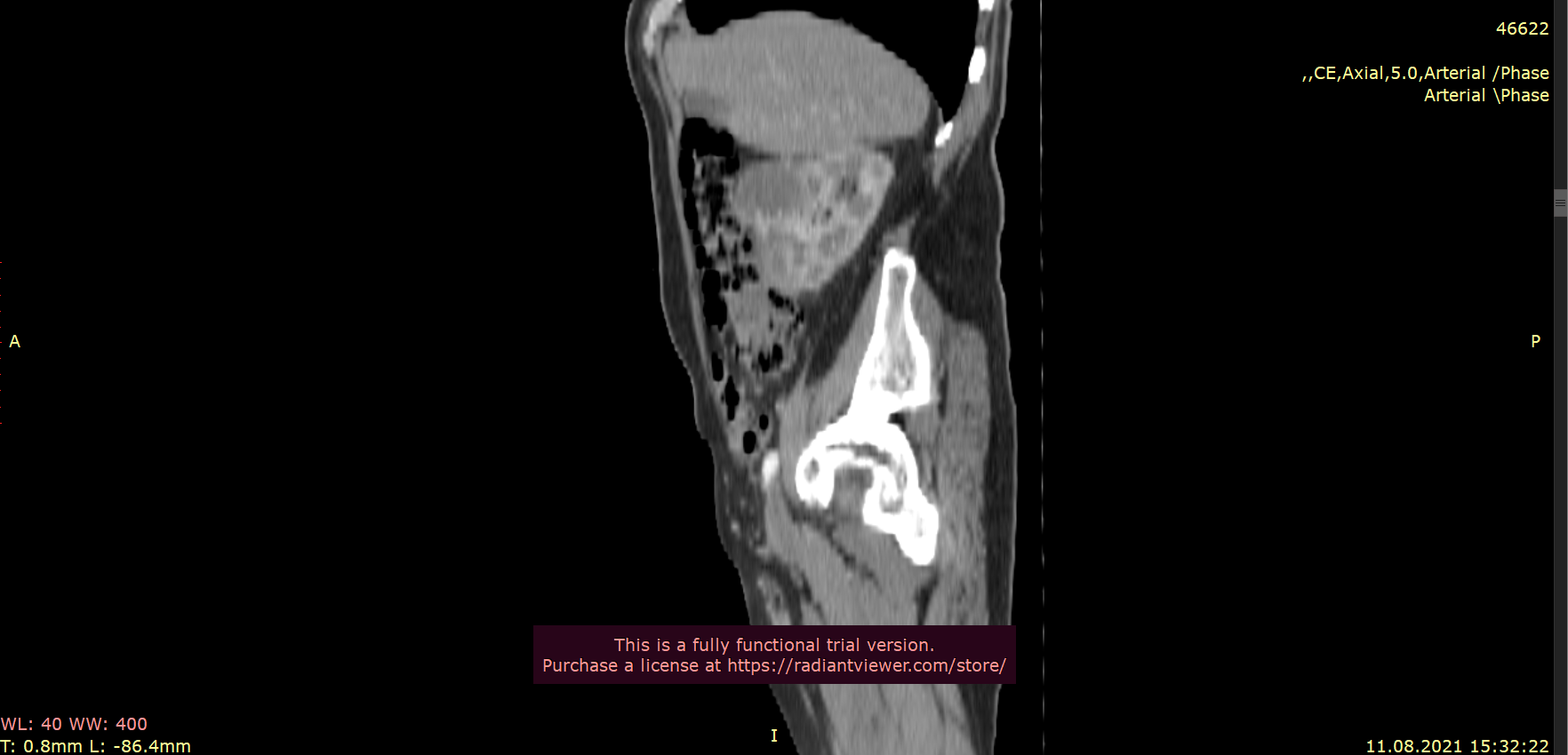 Права нирка типового положення, деформована за рахунок наявної неопластичної інфільтрації в передньо-латеральних відділах паренхіми середньо-нижнього сегментів з формуванням вузлового компоненту, що частково виходить за межі та деформує поверхню розміром 55*45 мм, структура гетерогенна з нерівномірним накопиченням контрасту, чітке відмежування від паренхіми – відсутнє. Нерівномірно сегментарно обтурован просвіт миски за рахунок інфільтрації на всьому протязі до рівня мисково-сечовідного сегменту.